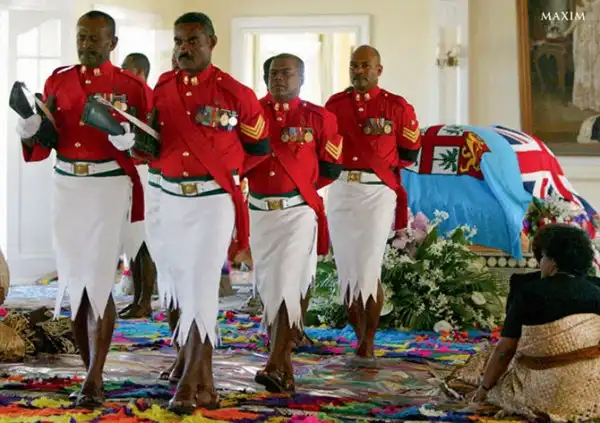 Вы не поверите, но эти босоногие полувоины-полуженщины в драных юбках тоже почетнейший из караулов. Более того, они несут вахту памяти у гроба бывшего президента Фиджи Рату Камисесе Капаиваи Туимакилаи Мара. Но даже такой печальный повод не заставил их что-либо поменять в своем гардеробе. Ну хотя бы надеть траурные черные юбки и не менее траурные черные шлепанцы.