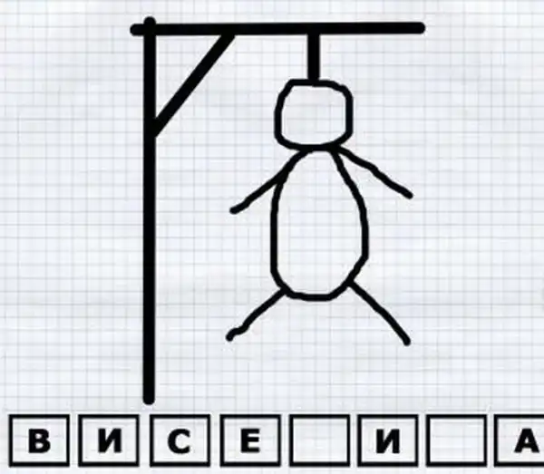 Один из игроков загадывает слово - пишет на бумаге первую и последнюю букву слова и отмечает места для остальных букв. Рисуется виселица с петлёй. Второй игрок предлагает букву, которая может входить в это слово. Если такая буква есть в слове, то первый игрок пишет её над соответствующими этой букве чертами - столько раз, сколько она встречается в слове. Если такой буквы нет, то к виселице добавляется круг в петле, изображающий голову. Второй игрок продолжает отгадывать буквы до тех пор, пока не отгадает всё слово. За каждый неправильный ответ первый игрок добавляет одну часть туловища к виселице. Если туловище в виселице нарисовано полностью, то отгадывающий игрок проигрывает, считается повешенным. Если игроку удаётся угадать слово, он выигрывает и может загадывать слово.