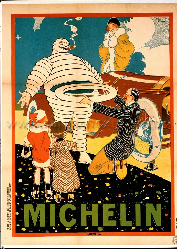 Но забавному Бибендуму, хотя тогда у него еще не было имени, только предстояло пройти путь от пьянчужки до всемирно известного рекламного символа. Сразу после создания шинный человечек не имел имени, его называли просто джентльмен Мишлен, так как он обладал всеми атрибутами богача. На пальце его красовалась печатка, во рту сигара.