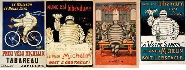 Следующим шагом к рождению своеобразной легенды стала карикатура руки Мариуса Россильона. На ней был изображен главный пивовар в окружении нескольких людей, находящихся с зеленым змием на короткой ноге. Именно тогда, в 1897 году, братья Мишлен вспомнили о колонне из шин, и Андре заказал себе постер с изображением вымышленного человечка. Плакат был создан только в 1898 году. В принципе, это была та же карикатура, но с некоторыми доработками. Так, вместо толстяка-пивовара с бокалом красовался человек из шин, а в кубке вместо алкоголя было битое стекло и гвозди. На оригинальном рисунке была надпись "Nunc est bibendum" ("Теперь надо выпить" ) - это начало оды Горация в честь победы императора Августа над объединенным флотом Антония и Клеопатры. Правда, по инициативе братьев Мишлен эта фраза была вольно переведена как "Шины "выпивают" неровности дорог". Парижане, надо сказать, быстро нашлись и обозвали созданного человека "дорожным пропойцей".