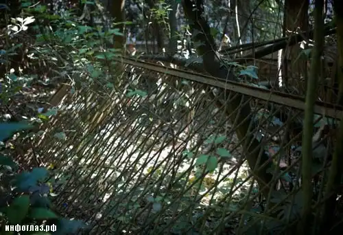 Границы между внутренним и внешним пространством практически стерты временем: балки перекрытий обрушились, потолок и оконные проемы затянулись плотной стеной из лозы.