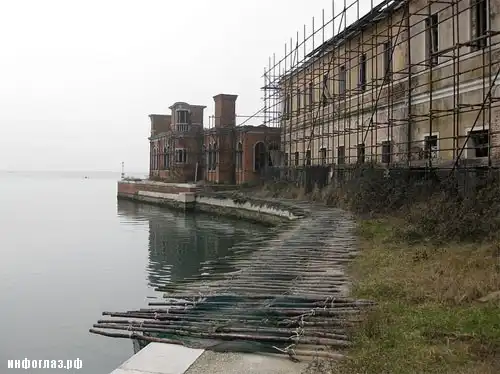 Оминув одну из сторон восьмиугольника, вы попадаете в узкий пролив, над которым, затерянное в густой поросли из деревьев и кустов, возвышается главное здание бывшей психиатрической больницы. Конечно, по словам венецианских властей, сооружение могло использоваться и в ином назначении, но его угрюмый вид никак не располагает к представлениям о доме отдыха для престарелых. Однако, в одной историко-документальной книге говорится, что в последние годы оно использовалось, как приют для бездомных.