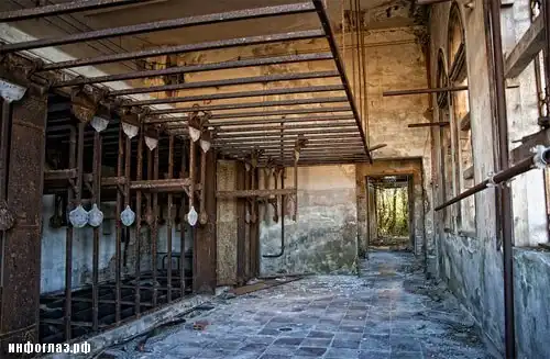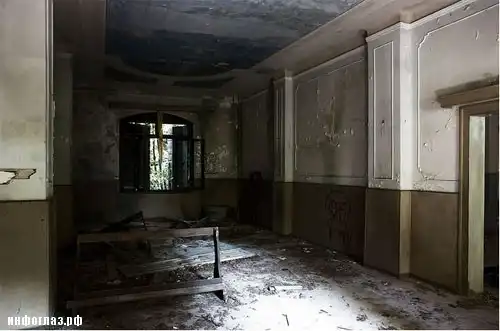 Смутное ощущение больничного присутствия добавляет внутреннее убранство помещения: тусклая, облупленная краска, кровати-нары и отодранные от стен карнизы. Дополняет картину маленькая часовня с позеленевшими от плесени стенами и сломанными скамьями, находящаяся там же.