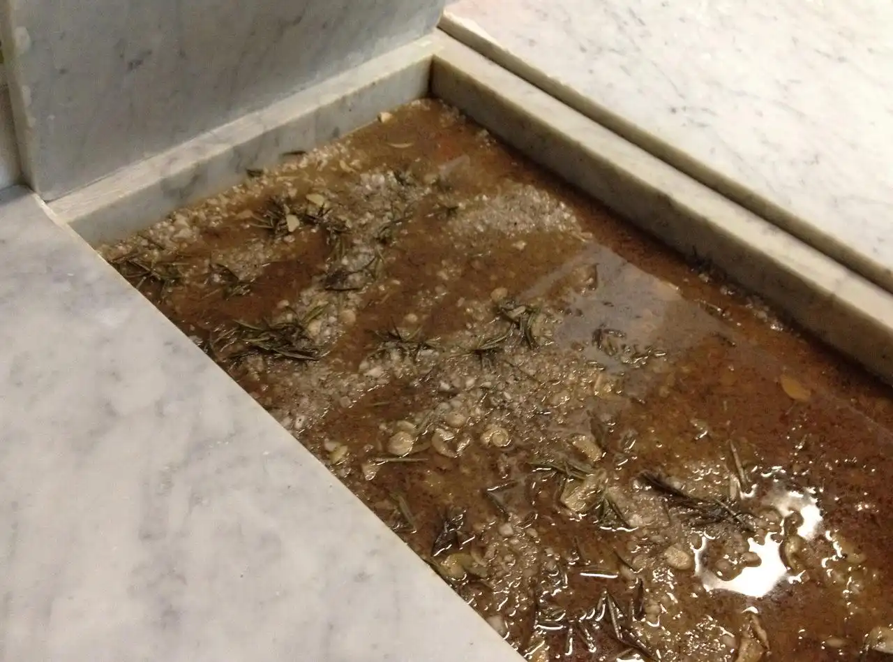 Контейнеры традиционно устанавливали в самой холодной части дома — в погребе; по своей сути это были предшественники современных холодильников. Натуральный мрамор, помимо своей красоты и прочности, обладает еще и очень высокой теплопроводностью. Прикоснитесь в жаркий летний день к его поверхности и сразу почувствуете приятный холодок. Для хранения продуктов лучше материала не придумать: мрамор быстро отбирает у них излишек тепла и рассеивает его в воздухе. Процесс засолки довольно прост. Сначала контейнер тщательно моется, его внутренние стенки натираются чесноком, а дно усыпают толстым слоем соли, перемешанной со специями и пряными травами. Набор их у каждого производителя свой; базовыми считаются розмарин, чеснок и черный перец. Шматки сала укладываются плотными пластами, пространство между которыми обильно пересыпается солью и душистыми травами. Их количество определяется дедовским методом, на глазок; как известно, сало лишней соли не возьмет, в отличие от мяса или рыбы. Заполненный контейнер закрывается мраморной крышкой. Все, дальше процесс пойдет уже без участия человека. Соль вытягивает воду из свиного сала, образуя крепкий рассол, в который постепенно переходят содержащиеся в травах душистые эфирные масла. Получается идеальный по своим свойствам природный консервант, в котором готовый продукт может храниться до двух лет даже в условиях жаркого итальянского климата