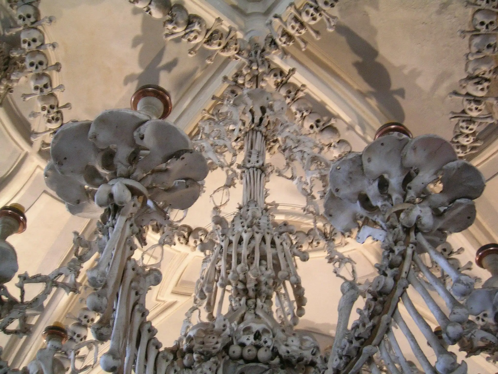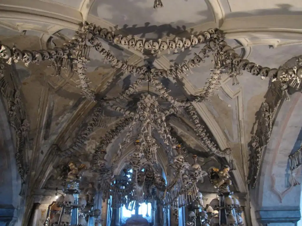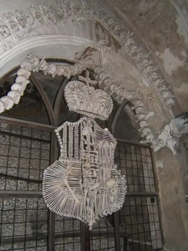Давным-давно в 13 веке чешский король Отакар II послал одного аббата на Святую место, в Израиль, откуда тот привез немного земли с горы Голгофа. Священную землю решено было рассыпать по кладбищу аббатства цистерцианского монастыря, который как раз находился в Седлеце. Весть об этом очень быстро разлетелась по всей Европе, сотни тысяч людей вожделели быть похоронены именно на этом кладбище. Помимо нескончаемого потока добровольцев, кладбище пополнялось жертвами чумы и средневековых войн. Вскоре места для всех хватать перестало. В 1400 г. решено было построить часовню, назначением которой должно было стать хранение костей, которые извлекали из старых могил в целях освобождения места для новых захоронений. В 1784 года монастырь закрыли, а часовню и земли, принадлежавшие аббатству, приобрела семья Шварценбергов, принадлежавшая к старинному и несметно богатому роду немецких аристократов. Спустя сто лет семья наняла резчика по дереву Франтишека Ринта, чтобы тот привел в порядок груды костей в часовне. Как именно он привел в порядок эти залежи, мы можем лицезреть в настоящее время.