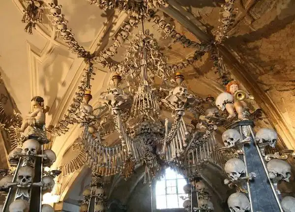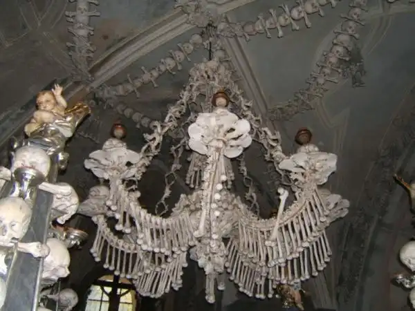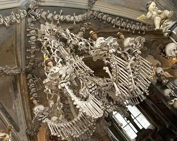 Речь идет о Костехранилище в г. Седлец, предместье чешского города Кутна-Гора. Эта постройка представляет собой Кладбищенский костёл Всех Святых, который украшен…человеческими костями! Для отделки этой часовни понадобилось порядка 40 тысяч скелетов! Выглядит это несколько ужасающе. «Как вообще могло появиться такое?» — спросит изумленный читатель. А история такова…