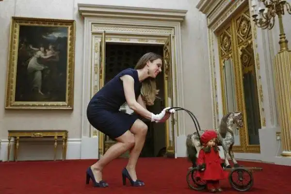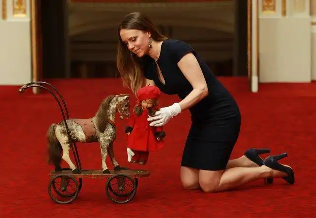 Куратор Анна Рейнольдс с куклой, которую зовут Памела и игрушечным конем на колесиках во время открытия летней выставки Королевское Детство в Букингемском дворце в Лондоне, на котором отмечают королевское детство с игрушками и семейными подарками, принадлежащими королевским детям, пока они росли, 2 апреля 2014.