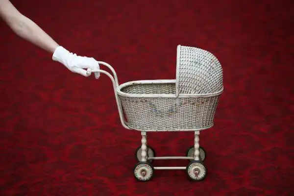 Кукольная колясочка, принадлежащая королеве Елизавете II показана в Букингемском дворце перед выставкой Королевское детство 2 апреля 2014 года в Лондоне, Англия.