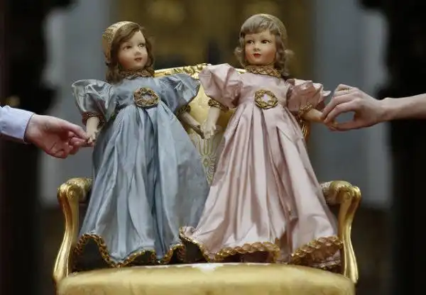 Пара парижских кукол, принадлежащих британской королеве Елизавете (кукла слева) и ее сестре принцессе Маргарет, показаны в Букингемском дворце в Лондоне 2 апреля 2014 года. Игрушки и детские наряды, принадлежащие королевской семье станут частью выставки «Королевское детство», во время летнего открытия Букингемского дворца 26 июля — 28 сентября.