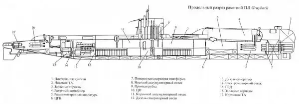 Американская дизель-электрическая подводная лодка «Грейбэк» (USS Grayback (SSG-574);»Grayback»-»Серая спина»;прозвище в ВМС США-»Северотихоокеанский яхт-клуб»,за частое пребывание в море),50-х гг. постройки,предназначенная для обеспечения решения транспортно-десантных и разведывательно-диверсионных задач (ранее использовалась,как ракетная подводная лодка- носитель самолетов-снарядов «Регулюс»)