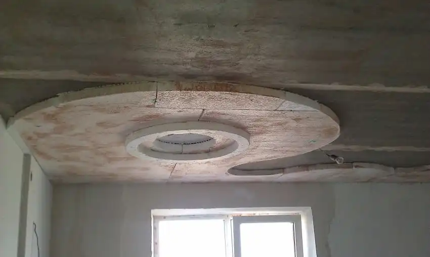 Через штукатурную сетку наносим гипсовую штукатурную смесь (в нашем регионе используют Ротбант, он дольше сохраняет эластичность). По периметру так же на Ротбант садим гибкий пластиковый уголок. Все выравниваем Ротбантом.