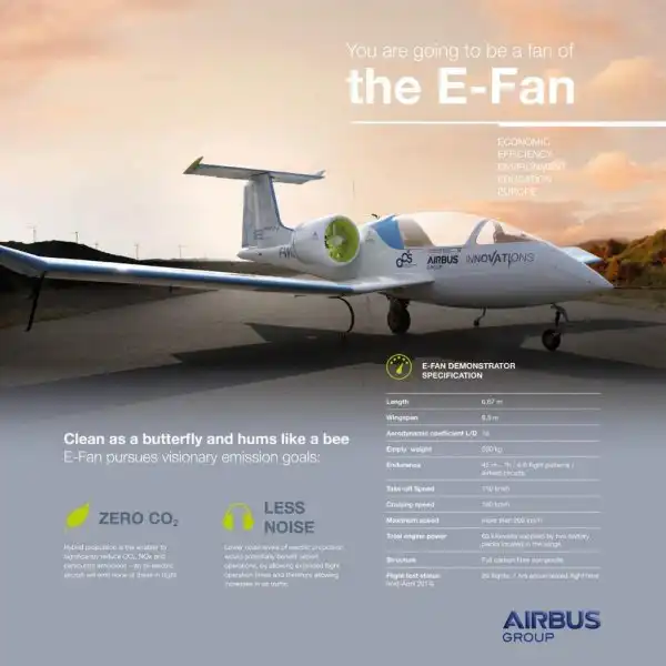Команда разработчиков под руководством конструктора и пилота Дидье Эстейна (Didier Esteyne) в конце апреля провела на юго-западе Франции первое публичное испытание E-Fan — лёгкого двухместного самолёта, которому для полёта нужна только электроэнергия. Группа работает в компании Airbus, входящей в состав Европейского аэрокосмического и оборонного концерна (EADS).