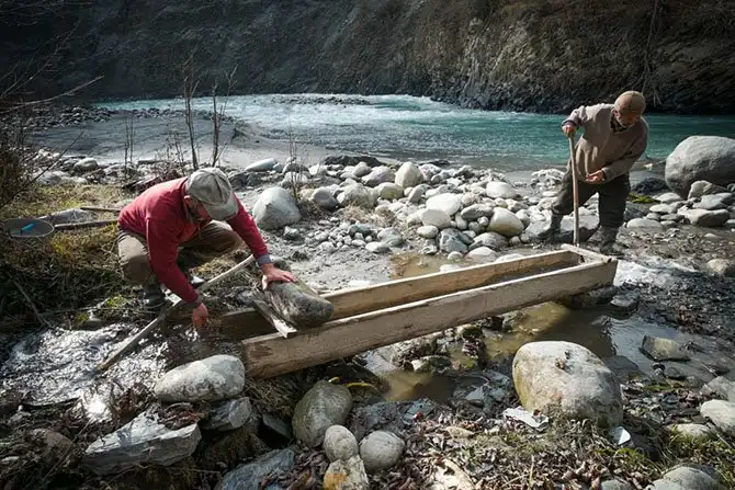 Когда молитва закончена, начинается работа. Эмо роет яму, он хочет добраться до слоя, в котором, с его слов есть золото. Яма выкапывается возле камня, и он объясняет, что тут чаще всего попадается песок. Его брат идёт дальше по берегу и начинает корчевать пластинчатые камни.