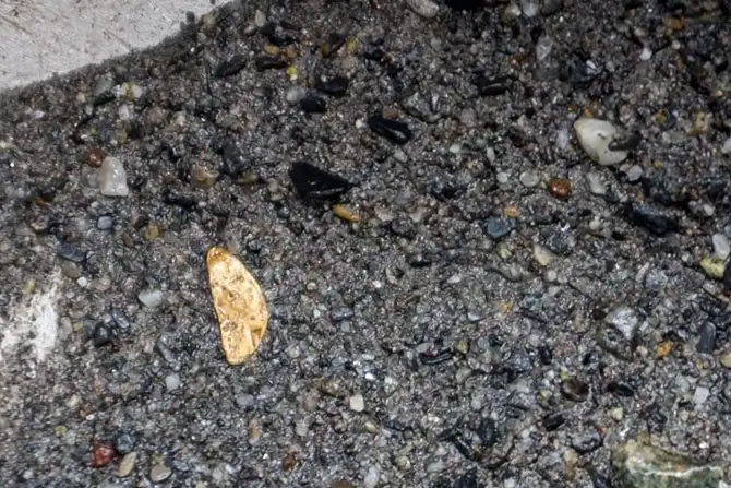 Увидеть тут что-либо нереально, только потом, промыв этот песок. Тяжёлое золото, по теории, оседает первым и задерживается тут.