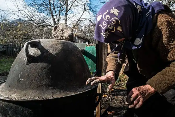 Мы возвращаемся снова в дом Эмо, пока мы у реки намывали золото, пепелац вовсю раскочегарили и он уже начал выдавать первые миллилитры вкуснятины. Тут самогон называют «арака». Бабушка следит за костром.
