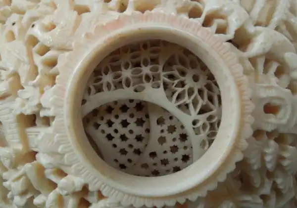 Настоящей жемчужиной среди прочих шедевров, выполненных из слоновой кости, признаны «решетчатые шарики внутри шариков» . Первым шагом в изготовлении этого чуда является превращение куска кости в идеальный шар, после чего в нем на необходимом расстоянии просверливаются несколько отверстий конической формы, чьи вершины сходятся точно в центре шара. Затем мастер с помощью линейки отмечает в каждом отверстии, сколько шариков он хочет выгравировать внутри первого. Теперь он может приступать непосредственно к вырезанию шариков, начиная с лежащего в самом сердце будущего «решетчатого шарика» . Мастеру приходится полагаться лишь на собственное чутье, годы опыта и острое лезвие своего резака, т. к. проделанные отверстия не позволяют ему видеть, что происходит внутри шара. Все последующие шарики также вырезаются изнутри. При этом ошибись мастер хоть на волосок – и вся работа пойдет насмарку.