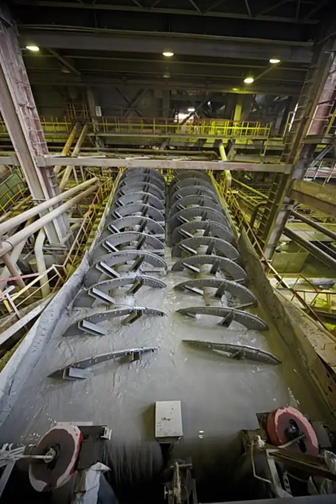 На следующем этапе спиральные классификаторы разделяют сырье в зависимости от его плотности и размера. Принцип работы очень прост. Вода подхватывает мелкие частицы и уносит в слив. Крупные частицы (размером до нескольких сантиметров) вода унести уже не в может – они оседают в нижней части резервуара, после чего спираль поднимает их наверх.