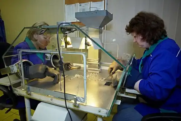 Разумеется, поток воздуха внутри сепаратора не может отделить только один маленький кристалл – вместе с ним отсеивается и какое-то количество пустой породы. По сути, весь процесс обогащения руды направлен только на то, чтобы минимизировать количество этого «пустого» материала и потом облегчить ручную обработку. Причем «ручную» в буквальном смысле слова: специалисты выбирают кристаллы, чистят их и проводят так называемую «конечную доводку».
