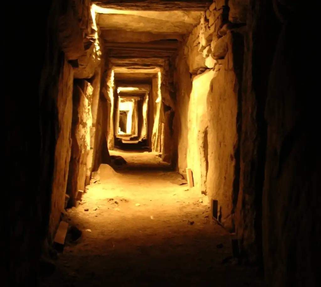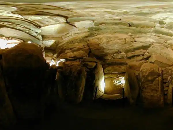 Некоторые из них искусно украшены мегалитическими рисунками и облицованы белым кварцем. Около входа сейчас стоит прислоненная к стене огромная плита, которой обычно по окончании строительства блокируют вход в гробницу. Длина коридора, занимающего лишь треть длины кургана, составляет 62 фута. Выложенный из грубо обтесанных каменных плит коридор ведет в крестообразную камеру с изумительным ступенчатым сводом на высоте 19 футов.