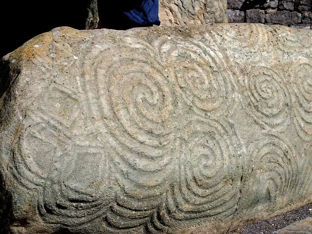 Это потрясающее явление было открыто профессором Майклом О’Келли лишь в 1967 г., хотя сведения о нем сохранились в местных легендах. Ньюгранж является одним из трех известных памятников с такими «световыми коробками». Другие два — это каменная пирамида «G» мегалитического комплекса захоронений Кэрроукил в графстве Слайго (Ирландия) и коридорная гробница из Брин Келли Дди (Bryn Celli Ddu) в Энглси (Северный Уэльс). Возможно, существует и четвертый памятник — погребальная камера, которую в 1998 г. обнаружили в Крантите на Оркнейских островах в Шотландии, но этот вопрос все еще остается дискуссионным. Любители тайн, может расшифруете эти то ли узоры, то ли надписи? Впрочем, Ньюгранж — самое большое и лучше других сохранившееся древнее сооружение. Эта потрясающая постройка является убедительным подтверждением того, что жители этой территории уже во времена неолита владели знаниями в области геодезии и астрономии, а создание помятника с учетом движения солнца в день зимнего солнцестояния свидетельствует о том, что солнце занимало важное место в их верованиях.