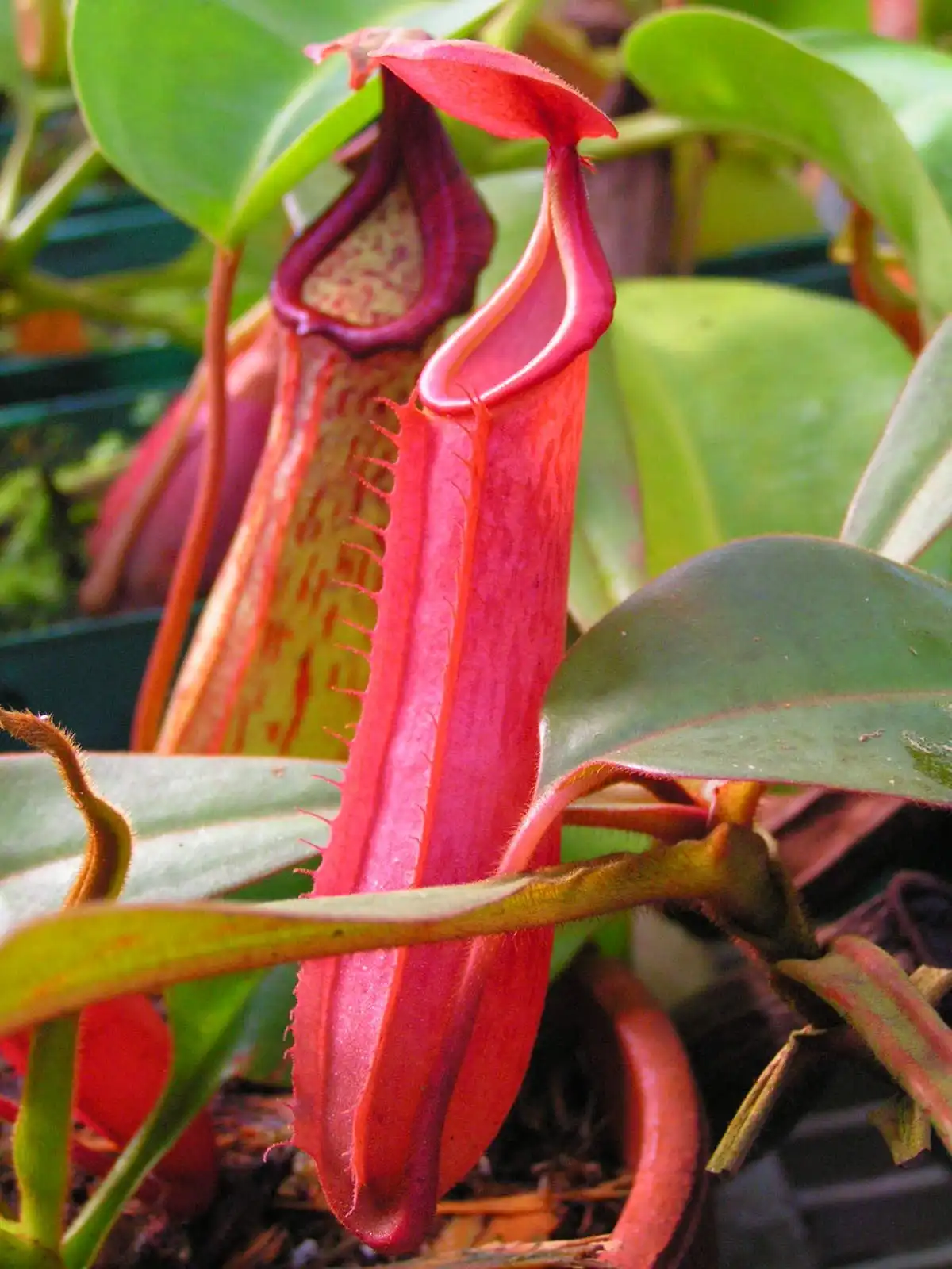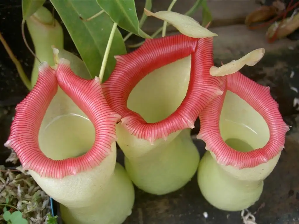 У непентеса волосатого (N. villosa Hook. f.) кувшинчики диаметром 5-12 см и 20 см в длину имеют очень мясистое красное околоустье.