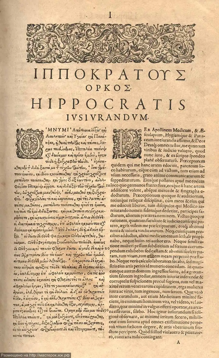 "Клянусь Аполлоном, врачом Асклепием, Гигеей и Панакеей, всеми богами и богинями, беря их в свидетели, исполнять честно, соответственно моим силам и моему разумению следующую присягу и письменное обязательство: считать научившего меня врачебному искусству наравне с моими родителями, делиться с ним своими достатками и в случае надобности помогать ему в его нуждах; его потомство считать своими братьями. Это искусство, если они захотят его изучать, преподавать им безвозмездно и без всякого договора; наставления, устные уроки и все остальное в учении сообщать своим сыновьям, сыновьям своего учителя и ученикам, связанным обязательством и клятвой по закону медицинскому, но никому другому. Я направляю режим больных к их выгоде сообразно с моими силами и моим разумением, воздерживаясь от причинения всякого вреда и несправедливости. Я не дам никому просимого у меня смертельного средства и не покажу пути для подобного замысла; точно так же я не вручу никакой женщине абортивного кессария. Чисто и непорочно буду я проводить свою жизнь и свое искусство. В какой бы дом я ни вошел, я войду туда для пользы больного, будучи далек от всякого намеренного, неправедного и пагубного, особенно от любовных дел с женщинами и мужчинами, свободными и рабами.