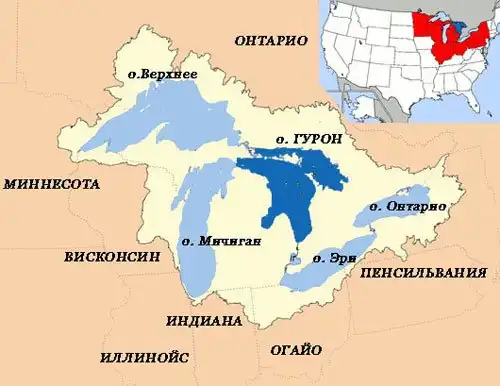 Озеро Гурон входит в состав пяти Великих озёр Северной Америки. Его берега делят между собой канадская провинция Онтарио и американский штат Мичиган. Этот водоём примечателен тем, что связывает в единую водную систему три других озера. На северо-западе это озеро Верхнее, осуществляющее связь с Гуроном через реку Сент-Мэрис. На западе располагается озеро Мичиган. Оно связано с нашим водоёмом проливом Макино. А вот южнее находится озеро Эри. Здесь связь более сложная.