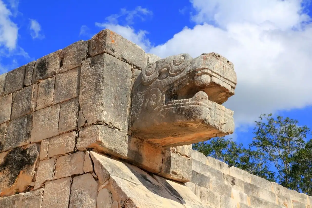Две такие змеевидные колонны стоят перед «Храмом воинов». Головы с роговидными отростком прижаты к земле, пасти широко открыты, туловища подняты кверху вместе с хвостами, некогда эти хвосты поддерживали крышу храма.