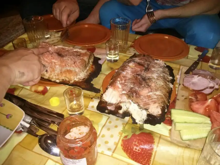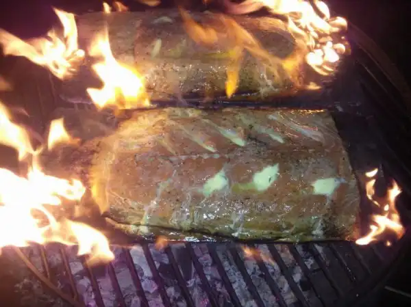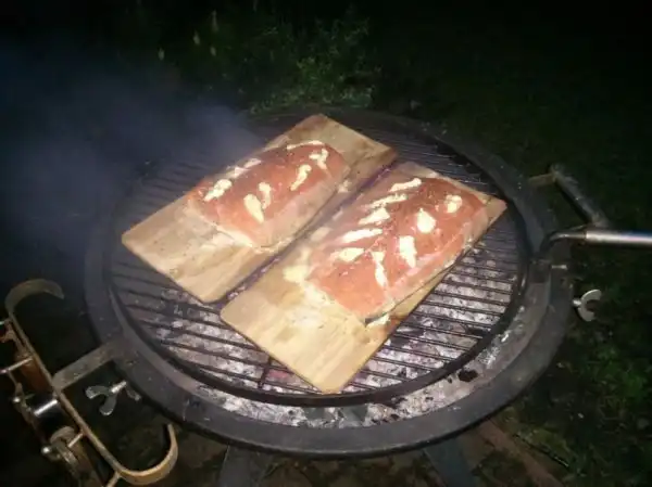 Процесса приготовления нет, но суть проста: дощечки обязательно надо замочить в холодной воде на 1-2 часа, затем на мокрую дощечку посыпается соль, перец и кладется рыба. Рыба сверху также посыпается солью и перцем, делаются вдоль волокон рыбы надрезы, в которые закладывается сливочное масло. И все это дело кладется на решетку.