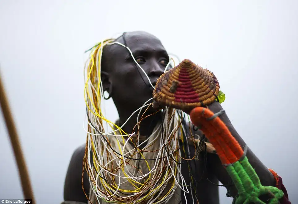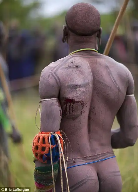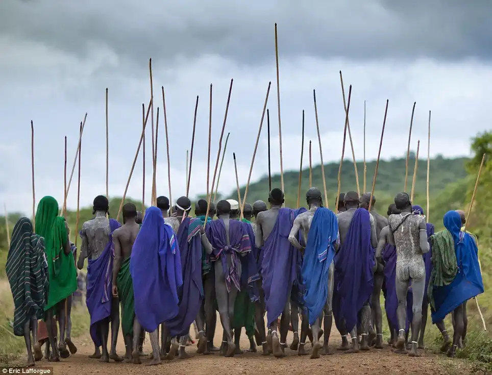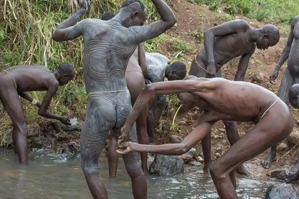 После кровавых ритуалов, мужчины Сурма идут голыми к реке.