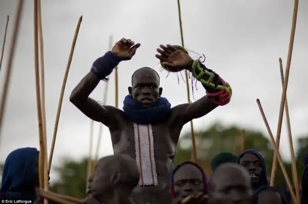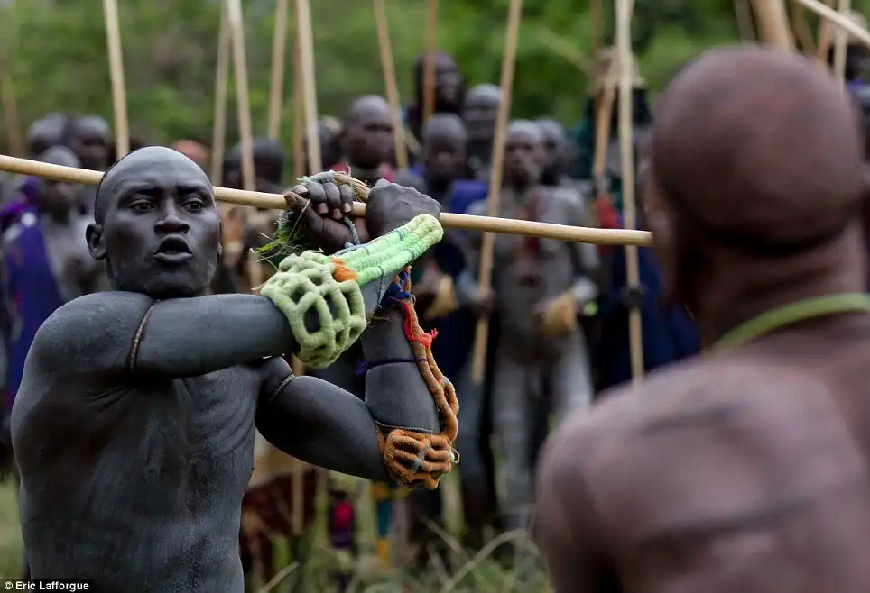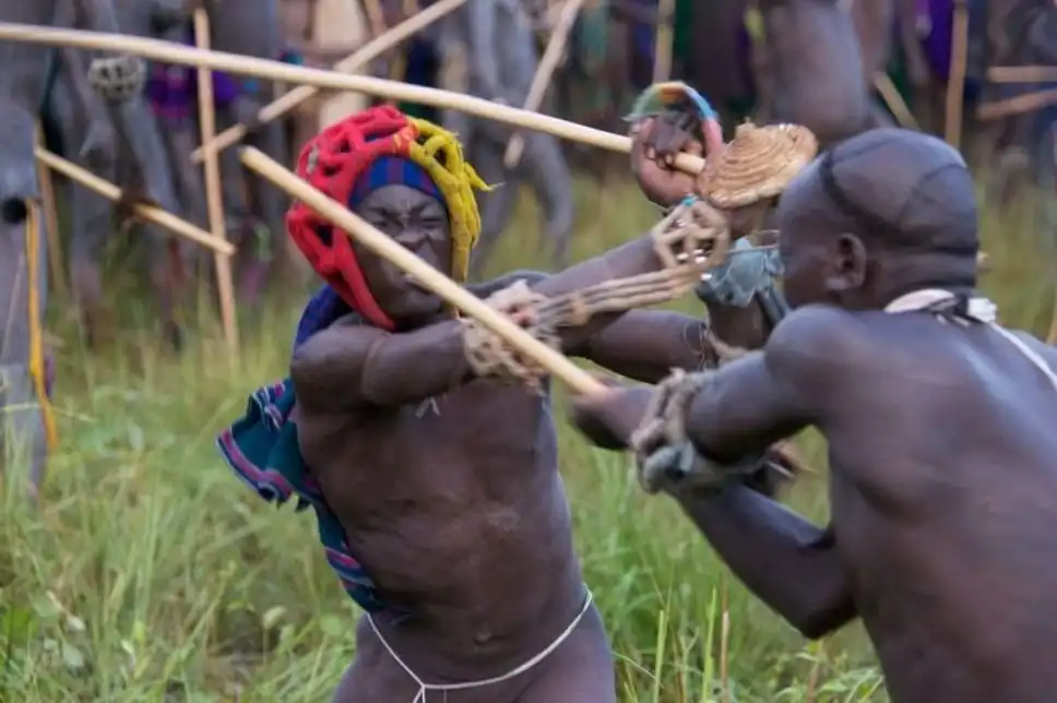Бойцы племени пришли принять участие в ритуальных боях "донга". Большинство воинов сражаются совершенно голыми, чтобы показать свою храбрость, и не носят какой бы то ни было защиты. Во время турнира боец может бросить вызов тому, кому он желает. Во время боев можно поражать любую часть тела противника. Существует только одно правило, которое заключается в том, что категорически запрещено наносить удары по упавшему сопернику. Скарификационые знаки, нанесенные острыми прутиками или бритвой, считаются признаком красоты. Женщины надевают ожерелья слоями и во время боев дарят их победителям.