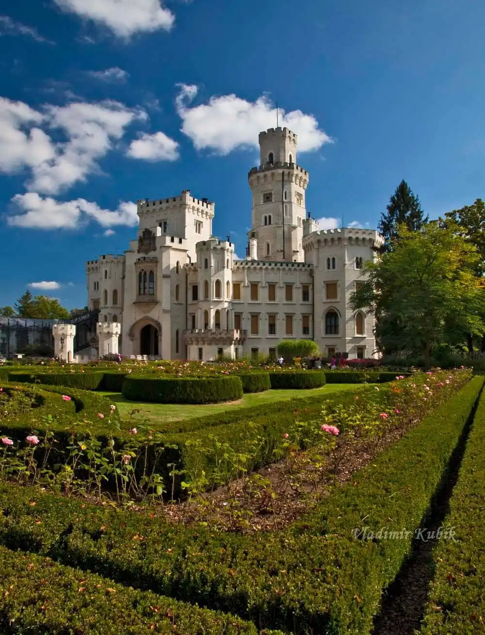 Замок Глубока-над-Влтавой, настоящая белоснежная жемчужина Южной Чехии. Еще издали приближаясь к городу Глубока-над-Влтавой становится заметен ослепительно белый силуэт замка, утопающего в окружающей его зелени. Высокие зубцы башен и неимоверные украшения, балконы и бастионы, кружева окон и белоснежные колонны, винтовые лесенки взмывающие в небо и даже дверные ручки, которые,кажется вот-вот оживут, все в этом замке пропитано сказкой, которая как будто только слетела с пера Уолта Диснея. Все это в окружении очарования красивого парка с симметричными разноцветными клумбами в обилии цветов и экзотических растений. А для завершения полноты, поражающей своей красотой, картины, замок, словно бриллиант помещен в драгоценную оправу из окружающих его озер кишащих рыбой и реки Влтавы.
