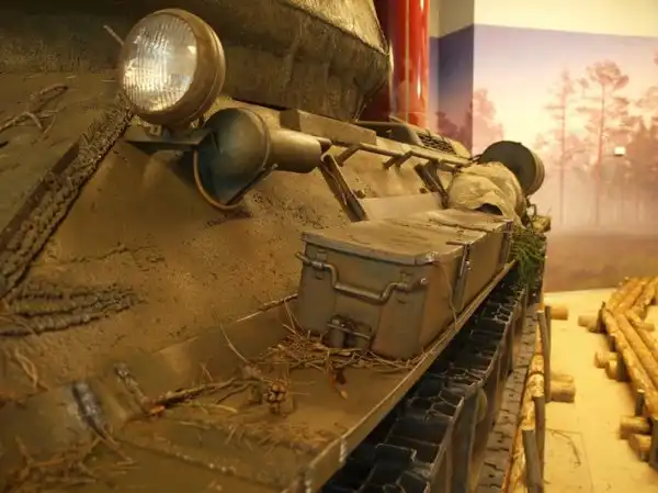 Все детали танка сделаны из пенопласта, за очень редким исключением - настоящие: антенна, лопаты, двуручная пила, триплексы, маскировочная сетка. Вот, пожалуй, и все.