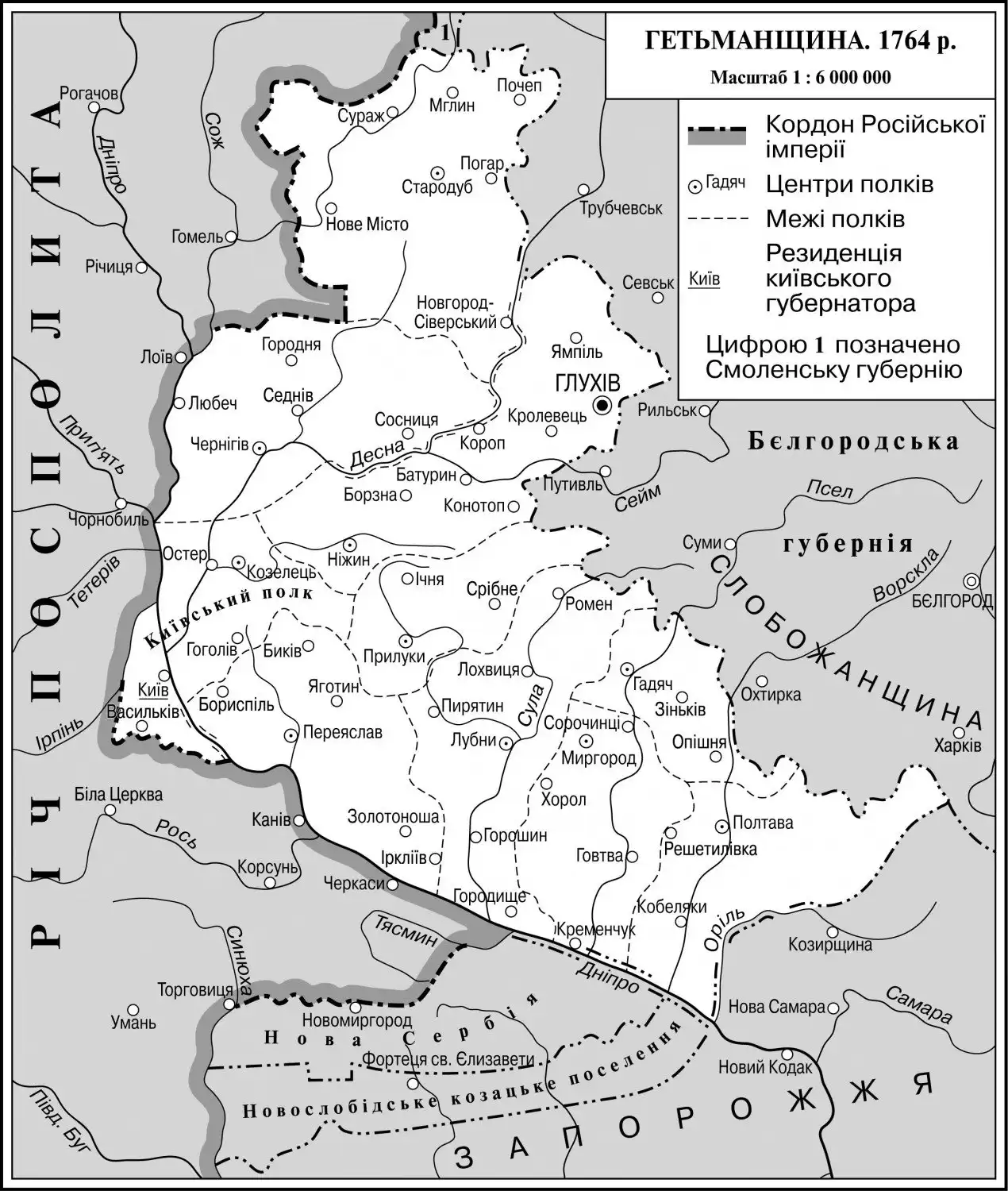 В административно-территориальном отношении Малороссия была поделена на «полки» и «сотни». Количество полков и сотен не были постоянным. Всего было учреждено 16 полков: 9 на правом берегу Днепра и 7 — на левом. На правом берегу Днепра: Чигиринский, Черкасский, Каневский, Корсуньский, Белоцерковский, Уманский, Брацлавский, Кальницкий и Киевский. На левом берегу: Переяславский, Кропивенский, Миргородский, Полтавский, Прилукский, Нежинский и Черниговский. Со временем территория полков и их названия могли меняться. Неодинаковым было и число сотен. В некоторых полках их было около десятка, в других до двух десятков. Отличалась и численность казаков в сотнях: в некоторых было 200-300 казаков, в других — от двух до нескольких десятков.