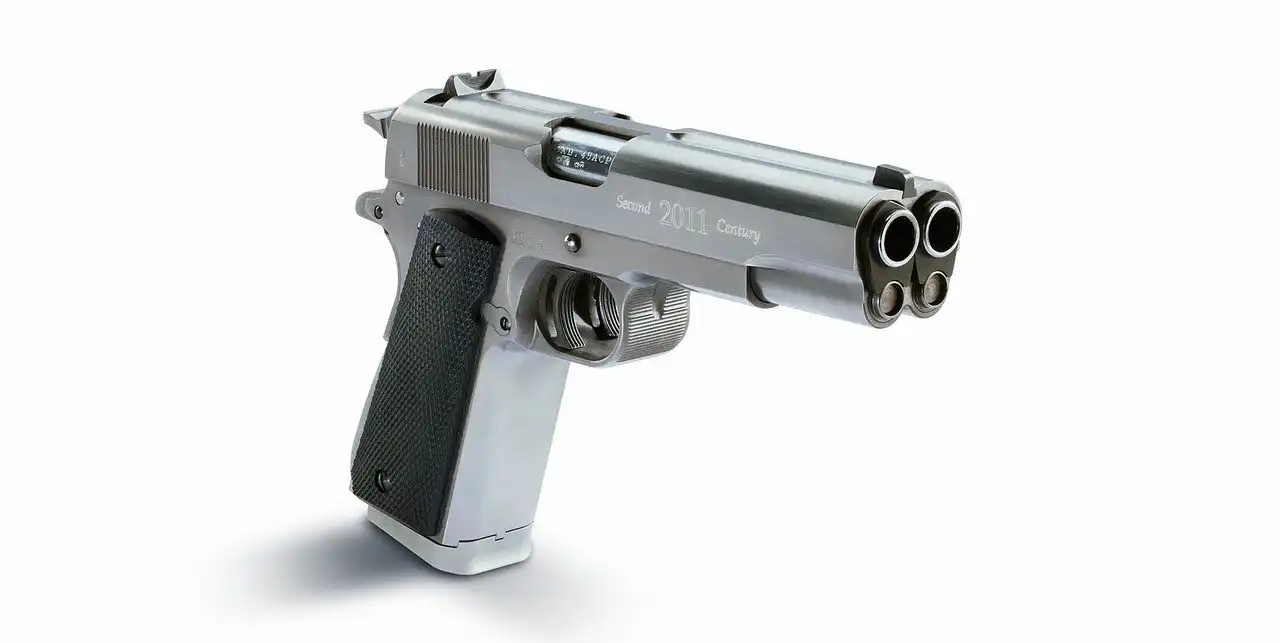 Однако поговорим мы именно о двуствольной разработке. Сообщается, что команда разработчиков Arsenal Firearms смогла создать пистолет AF2011-A1 «Second Century» всего за 6 месяцев интенсивной и плодотворной работы. При этом специалисты компании широко использовали стереолитографическое моделирование и компьютерные 3D-симуляции модели. В итоге на свет появилась интересная двуствольная модель пистолета 45 калибра, которая является промышленной и пользуется спросом у любителей стрелкового оружия.