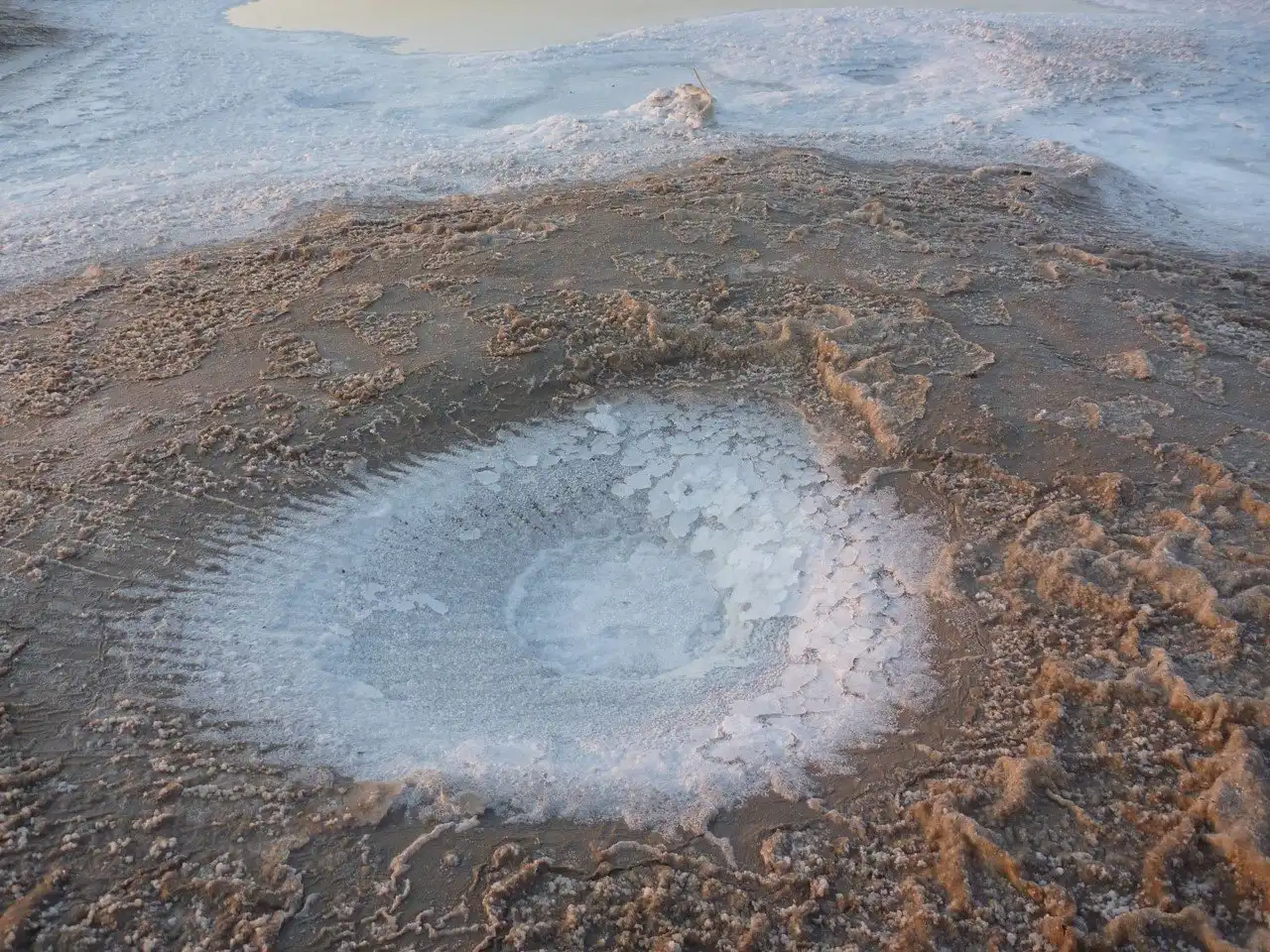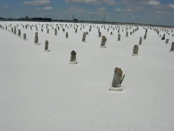 Берега озера Баскунчак состоят из чистейшей поваренной соли, а вокруг видны следы соледобычи. Ряды столбиков в соляном пласте – это разметка участка соледобычи. Заодно и лодку можно привязать, если уровень воды поднялся выше обычного.
