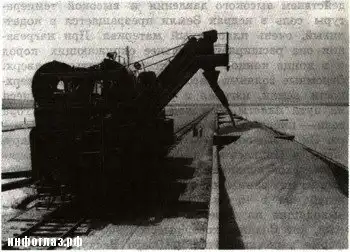 «За один час соледобывающий комбайн добывает и грузит в вагоны около 300 т соли! Внешне комбайн выглядит как двухэтажный вагон, он двигается по рельсам, уложенным прямо на слой соли. Наверху пульт управления, внизу стоит мощная фреза, которая разрыхляет плотную соль. Затем ее смешивают с водой, и полученную пульпу насосами направляют в специальную камеру. Здесь кристаллы соли специальными приспособлениями отделяют от воды, промывают и грузят в железнодорожные вагоны, которые подъезжают к комбайну по параллельным рельсам. Отсюда соль направляют на мельницу. За 1 ч «соляной корабль» успевает добыть столько соли, сколько раньше получали за то же время 200 ломщиков и 120 грузчиков и возчики, которые вывозили соль с помощью 300 верблюжьих повозок». Так писалось в газетах того времени. Источник.