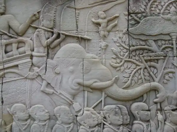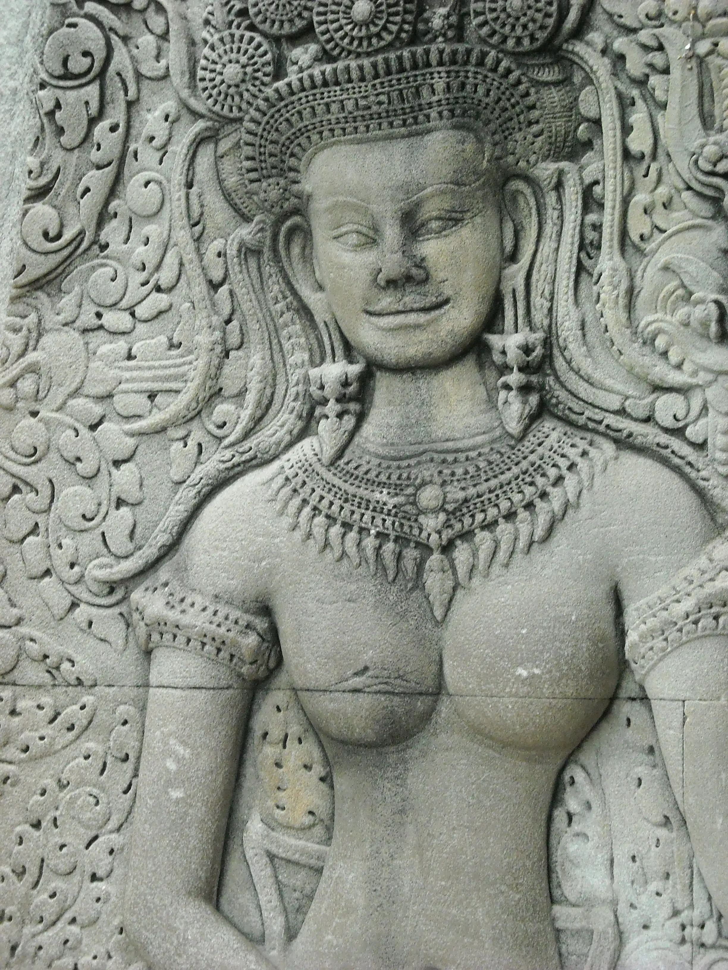 Самая популярная фигура, которая здесь встречается - это танцующая богиня Апсара. В центре комплекса на храме Байон изображен лик Бодхисатвы Авалокитешвары, одного из главных персонажей буддийской мифологии. Кроме изображений богов в храмах есть исторические картины. Например, те, которые изображают местных правителей, воинов, идущих на сражение.