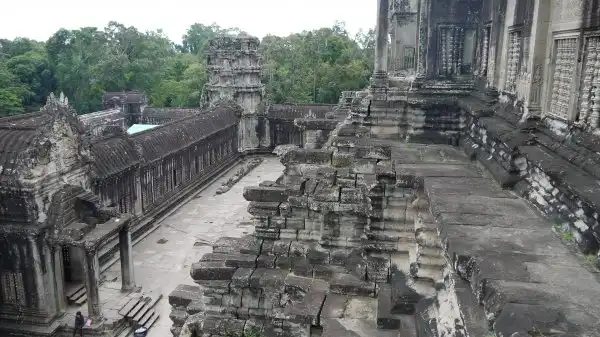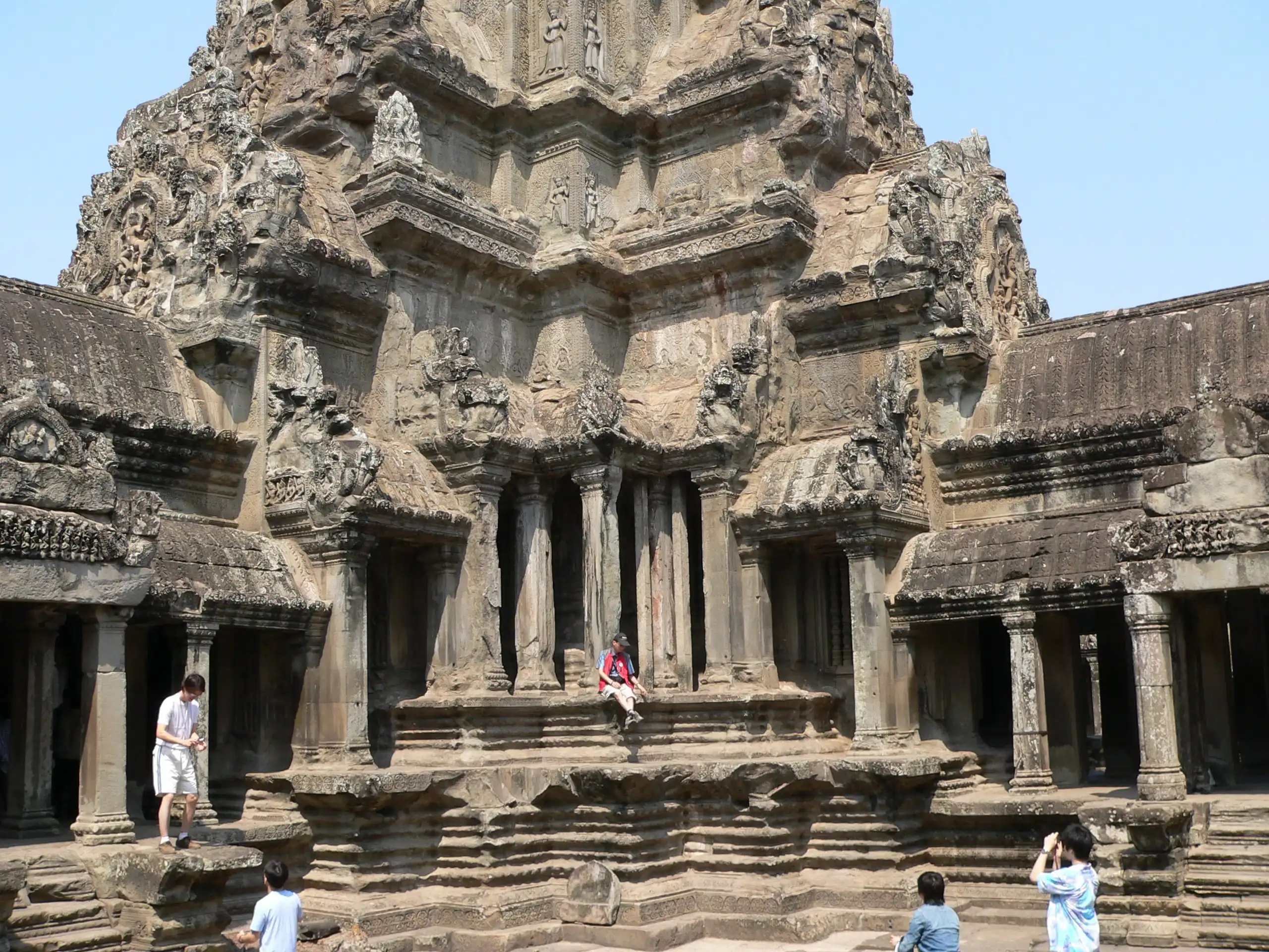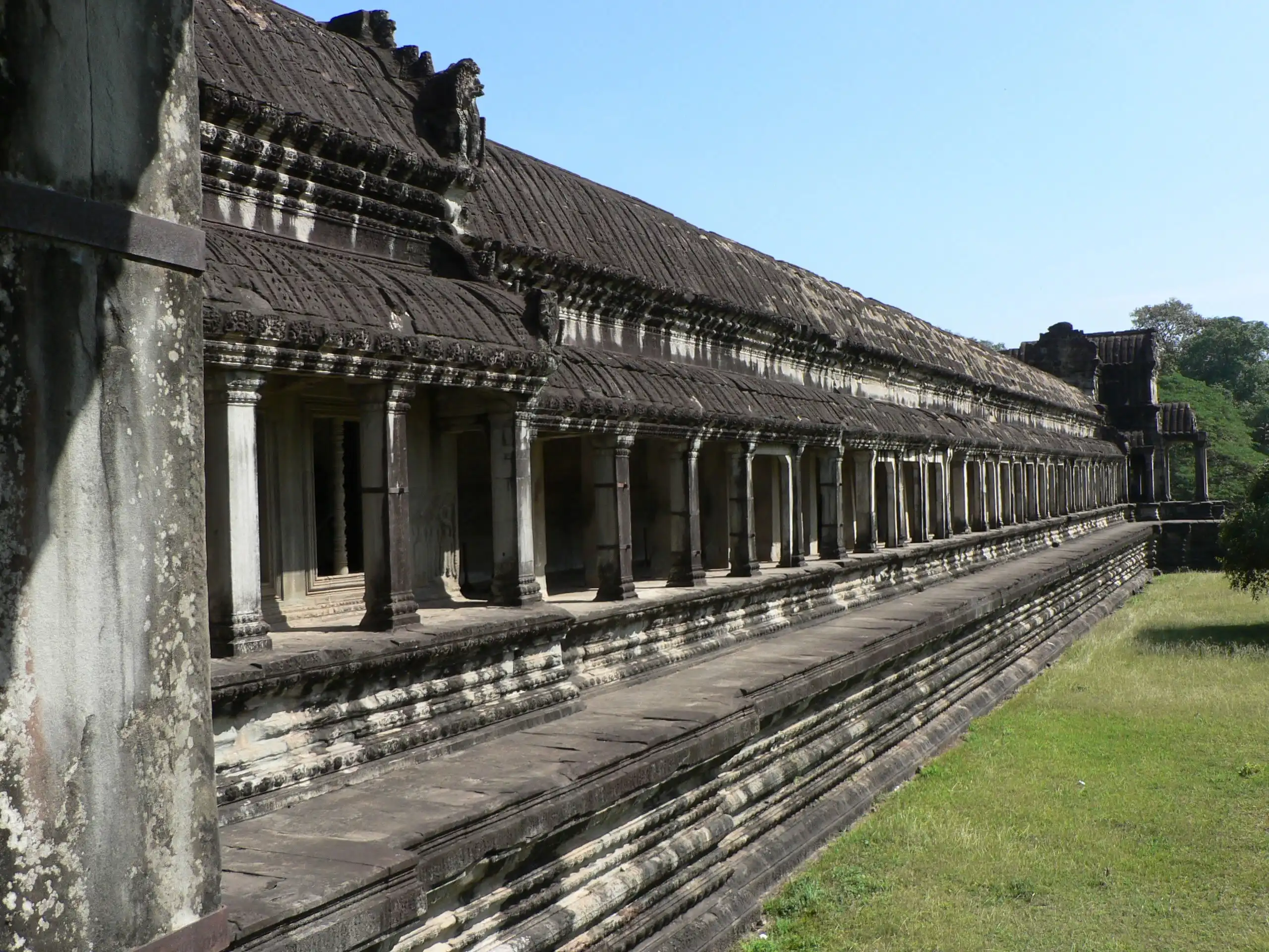 От центрального входа экскурсоводы ведут туристов направо и проводят до конца галереи, обращая внимание на окна с точеными колоннами и искусно вырезанные барельефы на стенах. В конце галереи можно увидеть все пять башен Ангкора.
