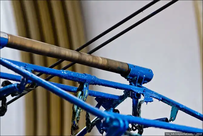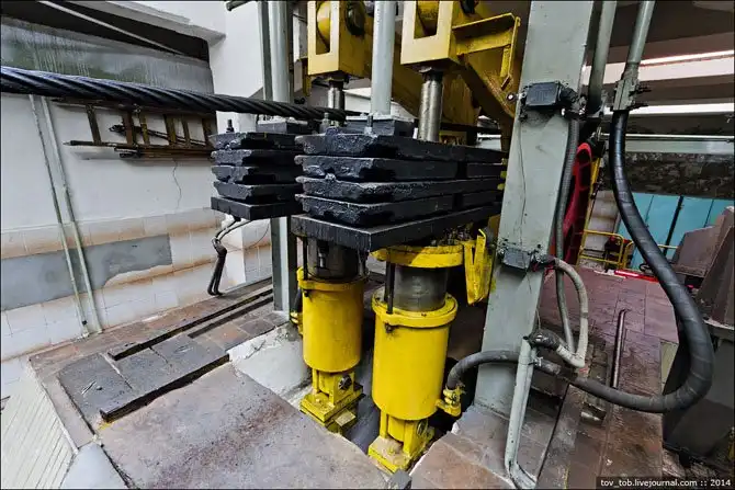 Тормозные колодки приводятся в действие с помощью пневматики (вот здесь и пригодились компрессоры). В обычном положении колодки с помощью грузов, которые вы видите на фото, прижимаются к шкиву и вагоны фуникулера находятся в заторможенном состоянии. При перемещении вагончиков в цилиндры поступает сжатый воздух и колодки разжимаются, отпуская шкив.