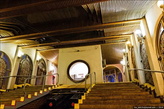 Внутреннее оформление нижней станции. Декоративные арки из металлопрофиля чередуются с арками из витражного стекла: