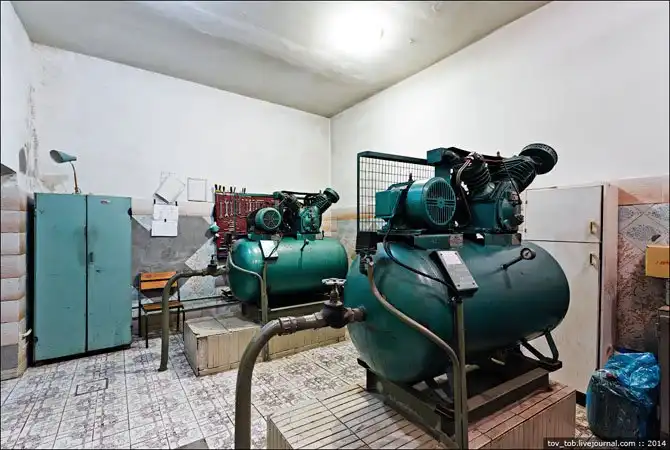 Прямо под рабочим местом машиниста находится помещение с тяговым приводом с основным тормозом. Спускаемся вниз и внезапно попадаем в комнату с двумя мотор-компрессорами. Ответ на мой вопрос «А зачем оно здесь?» нашелся в соседнем машзале.