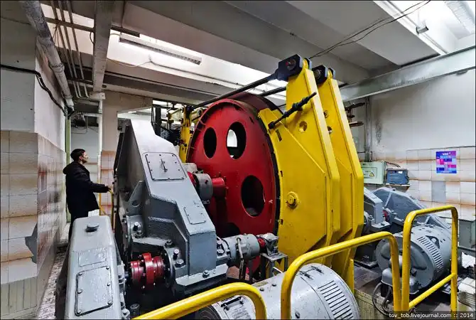 Машзал. Наиболее заметная деталь этого помещения – шкив, через который переброшен канат, удерживающий вагончики. С обеих сторон шкив обхватывают огромные тормозные колодки. На переднем плане видно два тяговых двигателя мощностью 82 кВт, которые питаются от сети напряжением 440 В.