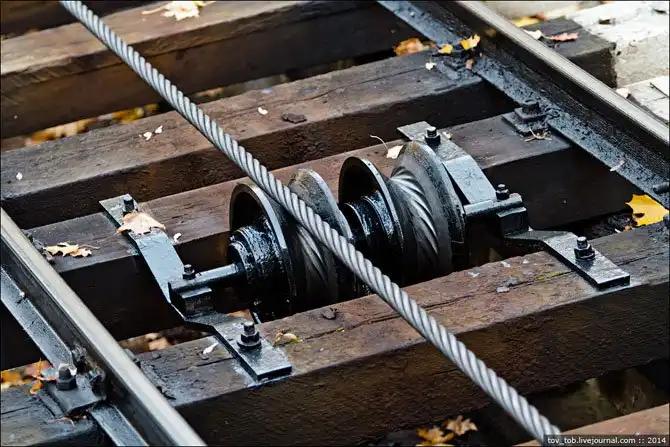 Канат, связывающий вагоны, уложен между опорными рельсами в специальную систему прямых и косых блоков, которые обеспечивают отклонение каната вдоль трассы: