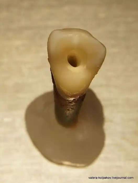 Дырку проделывают обычно круглым сверлом (справа), а потом вход в канал открывают пошире и делают воронкообразным другим сверлом (слева). Далее осматривают пещеру и смотрят сколько в нее открывается каналов. В нашем случае тут всего один, а может быть и по пять или даже по шесть!