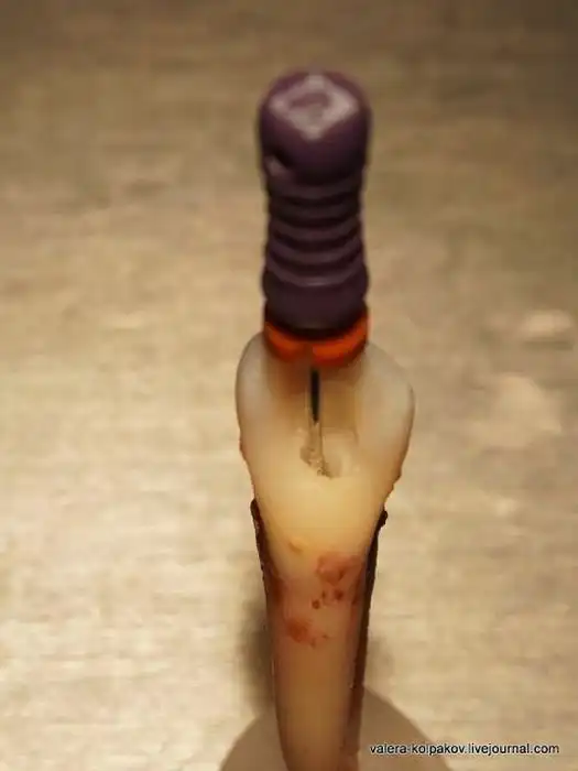 Начинаем осторожно исследовать канал, вводя туда инструмент, который называется эндодонтический файл. Английское слово file имеет еще и значение \«напильник\», потому и внутренности зуба мы будем чистить \«напильниками\». Если бы зуб был живой, я бы мог использовать и другие инструменты, которые бы сначала удалили \«нерв\». На самом деле никакого нерва в обычном понимании эдакого крепенького червячка — там нет. А есть кровяная сопля — зубная пульпа.