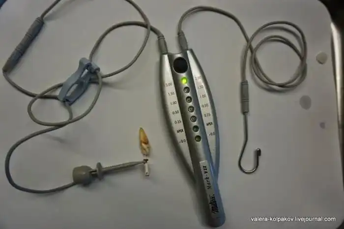 Более современные методы основаны на измерении электрического сопротивления вот, например, таким аппаратом. У аппарата два провода — справа с крючком на конце вешается на угол щеки. Левый крепится к файлу, который вводится в зуб.