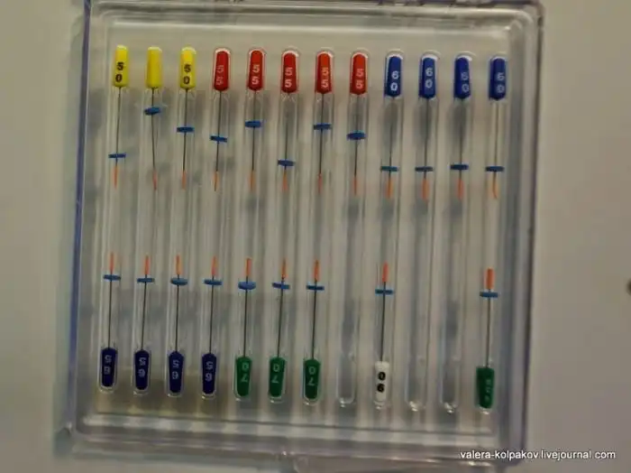 Вот, например, некоторые файлы, которыми пользуюсь я. В центре — ручные, используются в основном для исследования каналов. Справа — вращательные, которые обрабатывают исключительно область макушки. Такие файлы не очень распространены среди стоматологов, мне же они нравятся своей безопасностью. Если такой файл ломается в канале, то он ломается в месте соединения с рукояткой и легко извлекается. У меня параноидальная боязнь сломать файл в канале, потому такие файлы мне очень нравятся. Фиолетовый файл (самый правый) и группа левых файлов служат для придания окончательной формы каналу. Файлы обычно имеют специальную цветную кодировку, которая зависит от диаметра файла.