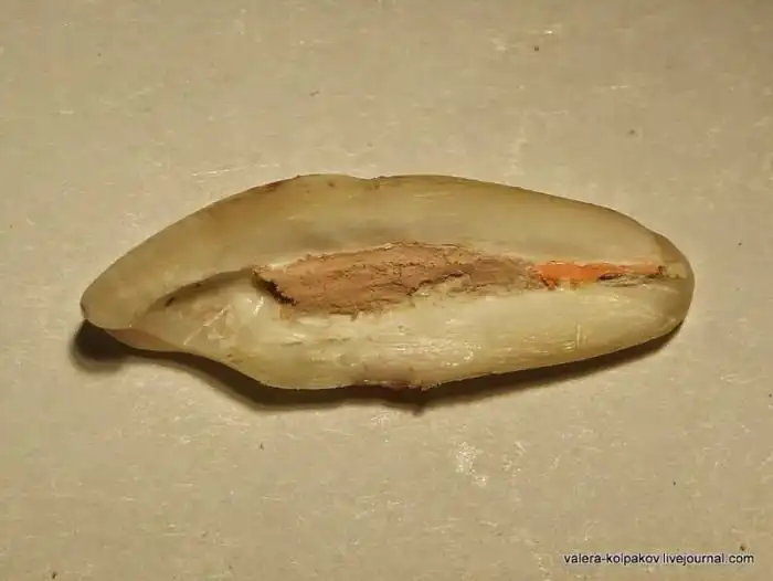 Пациента обезболили и настал черед, чтоб добраться до нерва. Для этого на внутренней поверхности сверлят дырку. В какой то момент сверло проваливается внутрь зуба. У нашего пациента нерв уже мертвый, потому он обнаружил себя просто дыркой. Если нерв еще живой, то он будет кровоточить. Если в канале завелась инфекция — оттуда может потечь гной.
