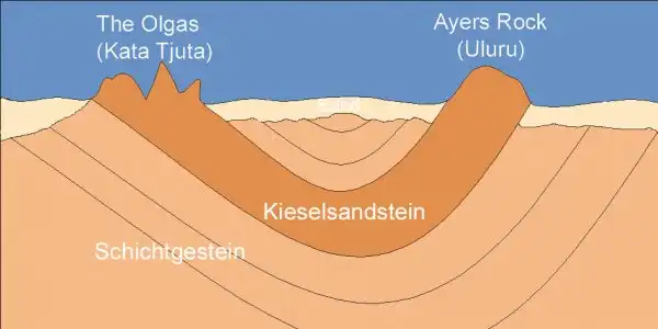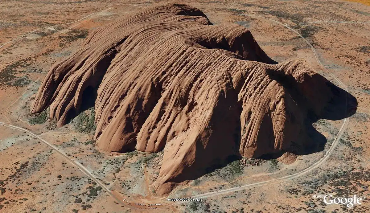 Некогда в центре континента возвышался горный массив, представляющий собой остров посреди озера Амадиес. Продукты разрушения горных пород откладывались на дне водоема, сформировав скалу. По внешнему виду Улуру напоминает лежащего на боку гигантского слона. Издалека монолит выглядит совсем гладким, однако вблизи на поверхности отчетливо заметны неровности, трещины и борозды.